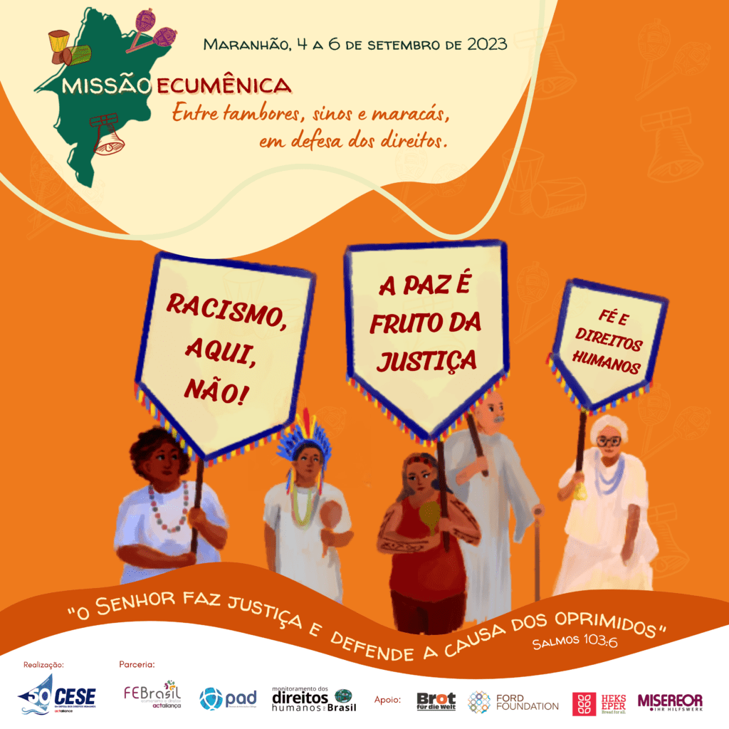 Entre tambores, sinos e maracás, dos dias 4 a 6 de setembro de 2023, missioneiros e missioneiras de diferentes organizações ecumênicas, igrejas e movimentos de direitos humanos foram acolhidas e enviadas pelas Caixeiras do Divino, em São Luís, capital do Maranhão, para a realização a 5ª Missão Ecumênica em defesa de Direitos.